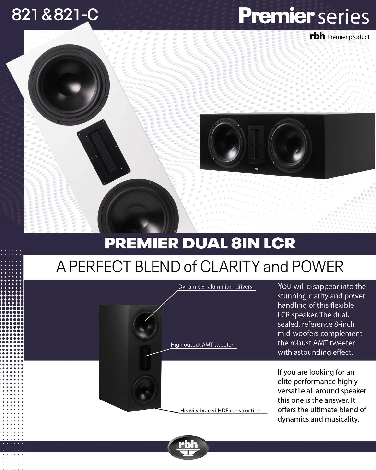 The reference version big brother to its smaller Reference 621-C, sibling, the Premier 821-C is a flagship center speaker that sounds big with ultimate dynamic range. Due to its lower frequency ability and effortless high-end produced by the reference quality large AMT tweeter 821-C excels. For home theater, the 821-C’s dual 8‑inch reference aluminum cone woofers add depth to the crystal-clear dialog and vibrant sound effects with superb clarity and acoustic performance. These reference drivers provide extended frequency response, greater power handling and improved dynamic range.