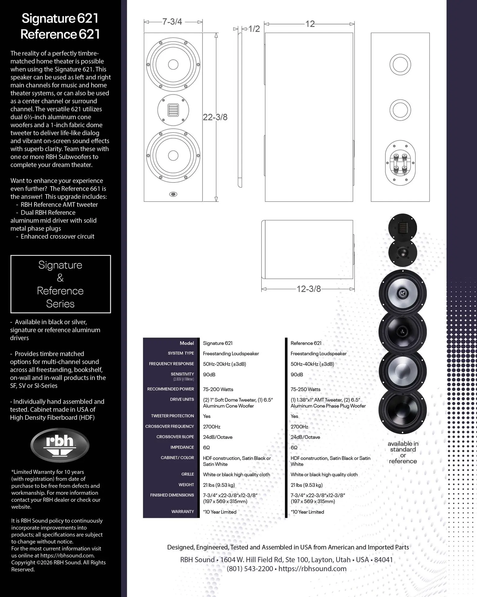 The reference version of its sibling, the Reference 621 can be used for high-fidelity 2-channel stereo systems and home theater systems alike. As a stereo pair, the 621 is sure to please listeners with a musical experience as the recording artist originally intended. For home theater, the 621's dual 6½‑inch reference aluminum cone woofers and AMT tweeter deliver crystal-clear dialog and vibrant sound effects with superb clarity and acoustic performance. These reference drivers provide extended frequency response, greater power handling and improved dynamic range. The 621 is versatile enough that it can be used for nearly any main or effect channel in a multi-channel surround sound system.