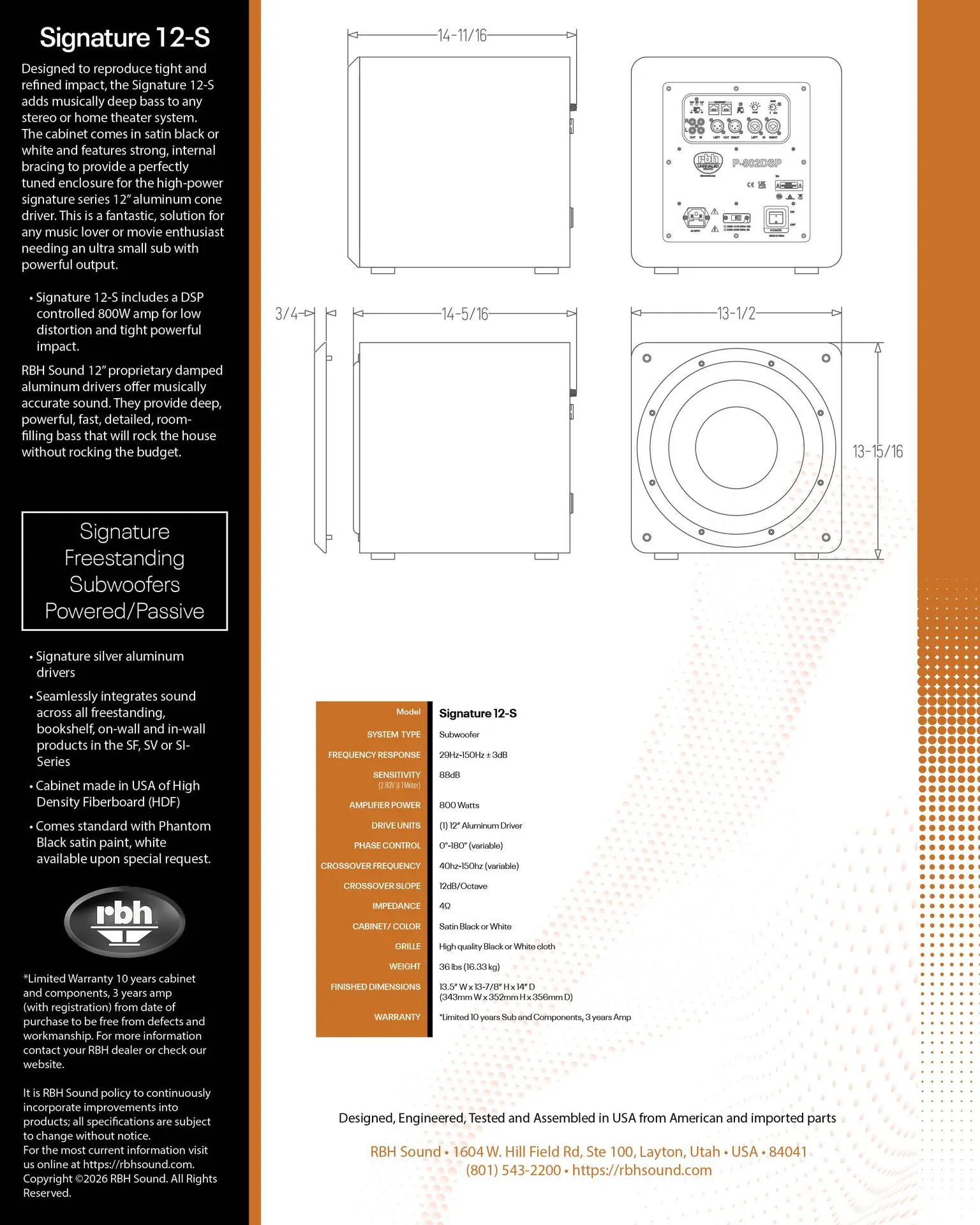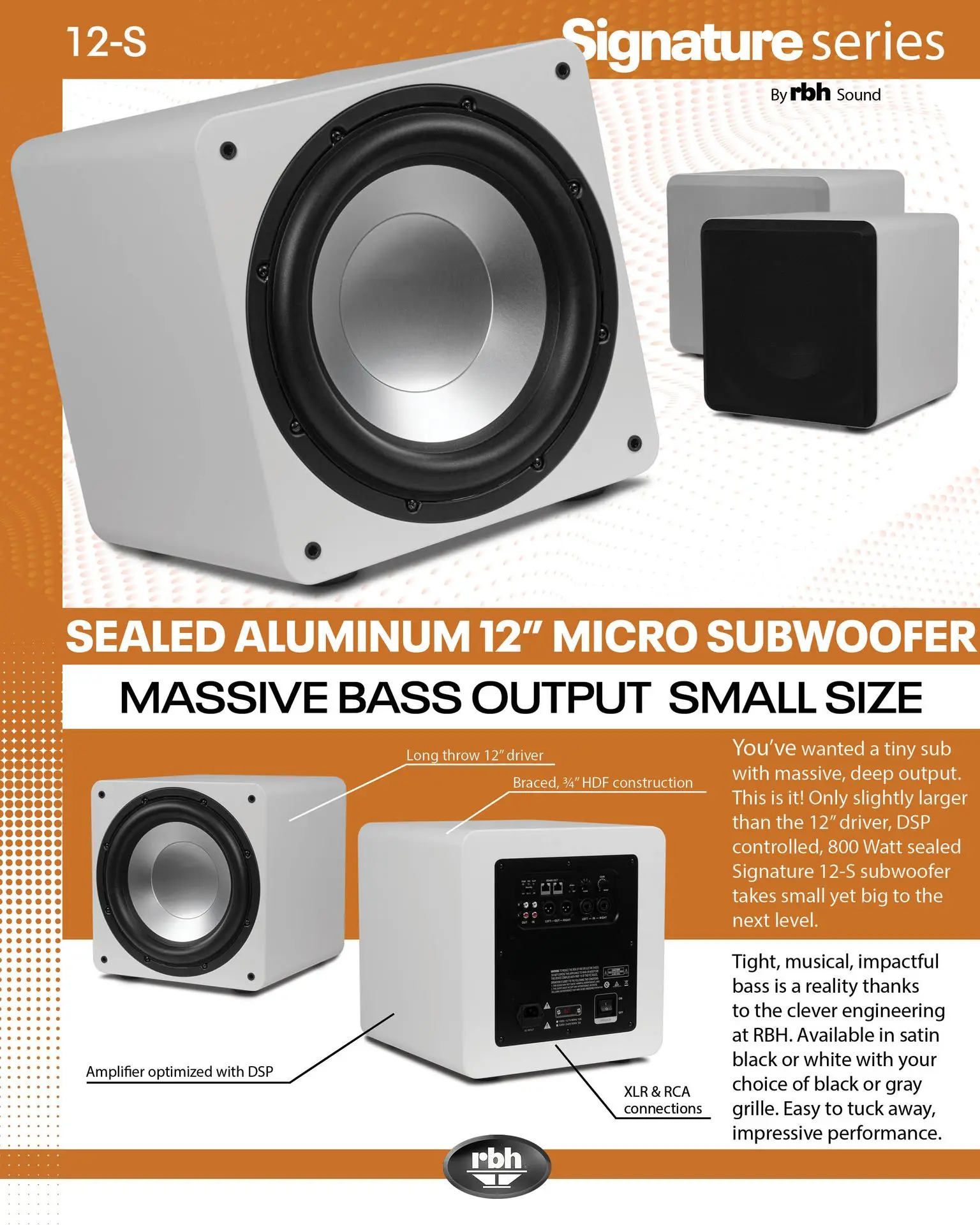 Designed to reproduce tight and refined bass, the Signature 12S adds deep bass to any audio or home theater system. The 12Ss matte black or white cabinet features intricate internal bracing and provides the perfectly tuned environment for its high-power 12-inch aluminum cone subwoofer. The 12S is a perfect compliment to any music lover and movie enthusiast alike.