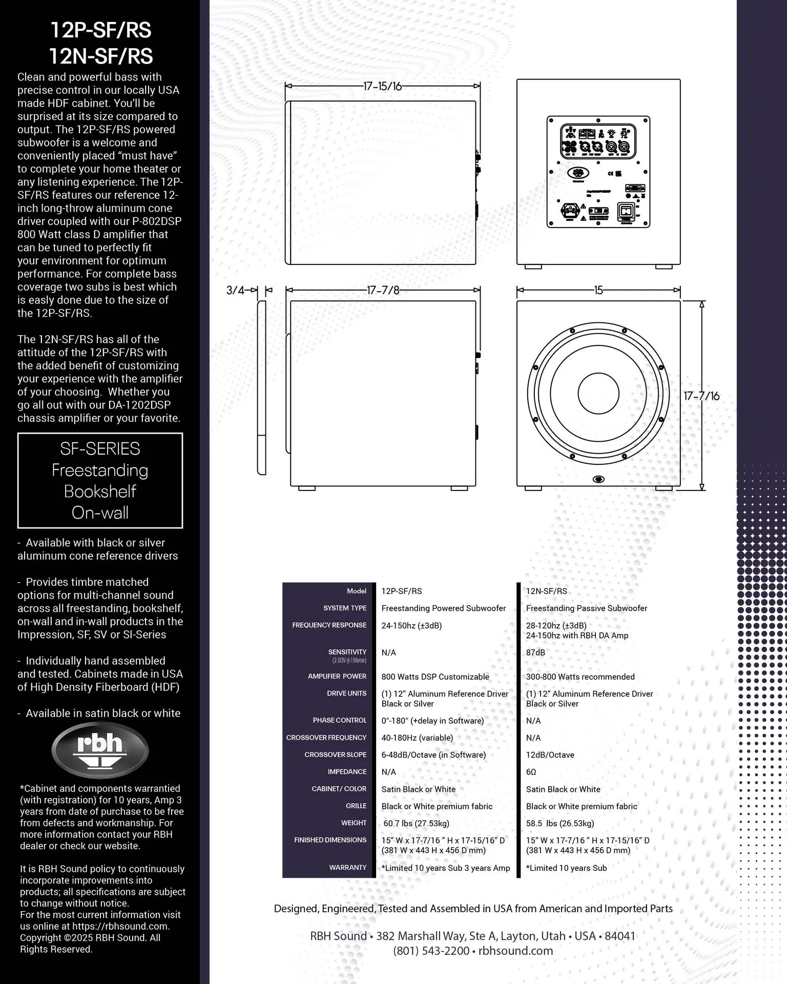 Built to deliver tight and accurate musical bass with power, the 12N-SF/RS subwoofer is a welcome and conveniently placed “must have” to complete your home theater or 2 channel system. The 12N-SF/RS has all of the perks of the 12P-SF/RS with the added benefit of customizing your experience with the amplifier of your choosing. Whether you go all out with our DA-1202DSP amplifier or provide your own, the power is in your hands.