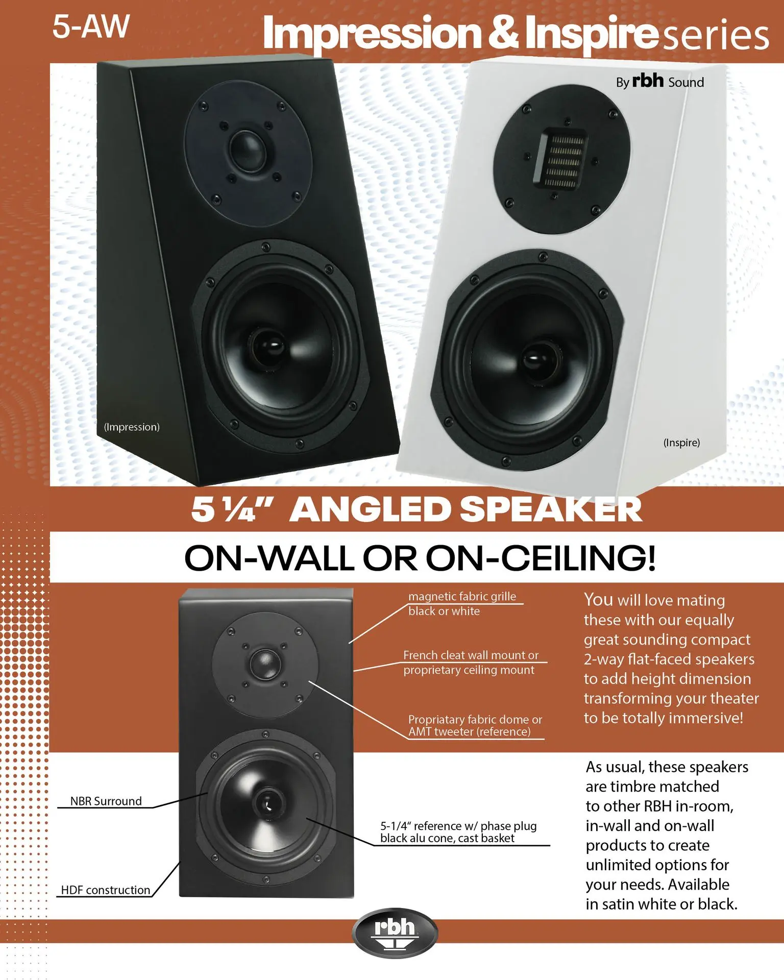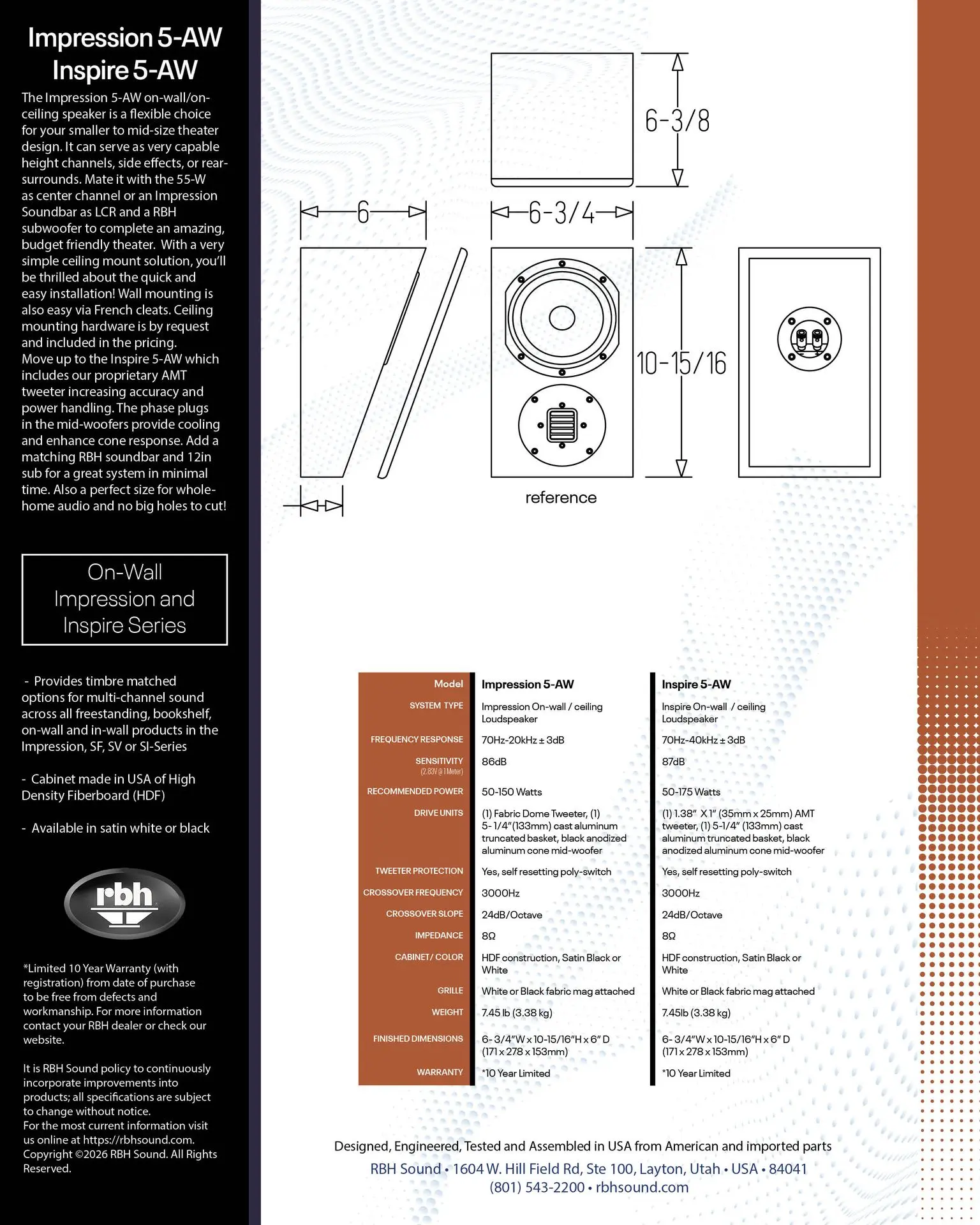 The Impression 5-AW is an excellent height speaker option that is perfectly timbre matched to the impression lineup of product. With versatile mounting options, the 5-AW can be mounted on the ceiling or on the wall. With it's small size and high quality build, the 5a-iw can fit in any room. This speaker is well suited for small rooms or as surrounds for medium sized room. Add a subwoofer for a truly budget level exemplary system. Of course it is perfectly timbre matched to its SF family partners for total flexibility enabling easy installation of your dream theater and can be located throughout the home for sublime music enjoyment. The 5-AW utilizes a single 5-1/4-inch aluminum cone woofer and a fabric dome tweeter. Mounting is easy via a “French cleat” system or ceiling mounted via a z-clip system.