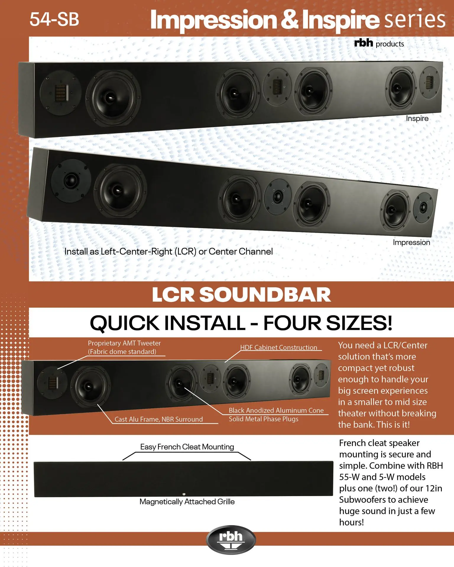 Step into the Signature line with the Impression 54-SB featuring an all new 5.25" Signature Aluminum cone truncated driver that allows the footprint of this speaker bar to be identical in footprint to the Ultra3-SW while still retaining a slim 3.75" of depth. The 54-SB with its satin black finish will complement your TV with a sleek look and provide an incredible sound.