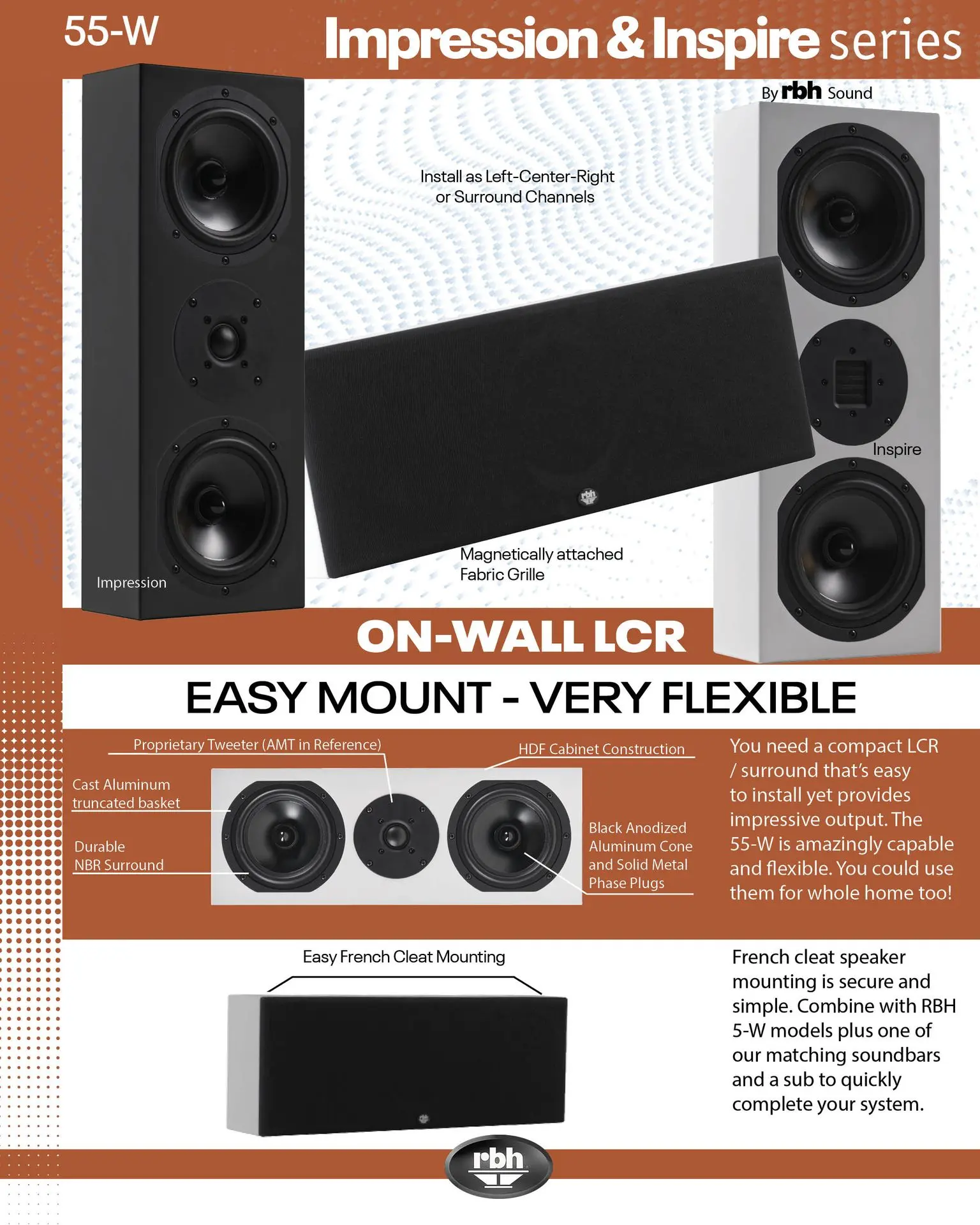 The Inspire 55-W is the ultimate value proposition with the RBH AMT tweeter and dual woofers for incredible clarity, dynamic range, and musical fidelity. With 5 speakers and 1 affordable subwoofer, you'll be amazed at the surround sound performance you'll experience. The 55-W utilizes two 5-1/4-inch aluminum cone woofers and a proprietary AMT tweeter. Mounting is easy via a “French cleat” system.