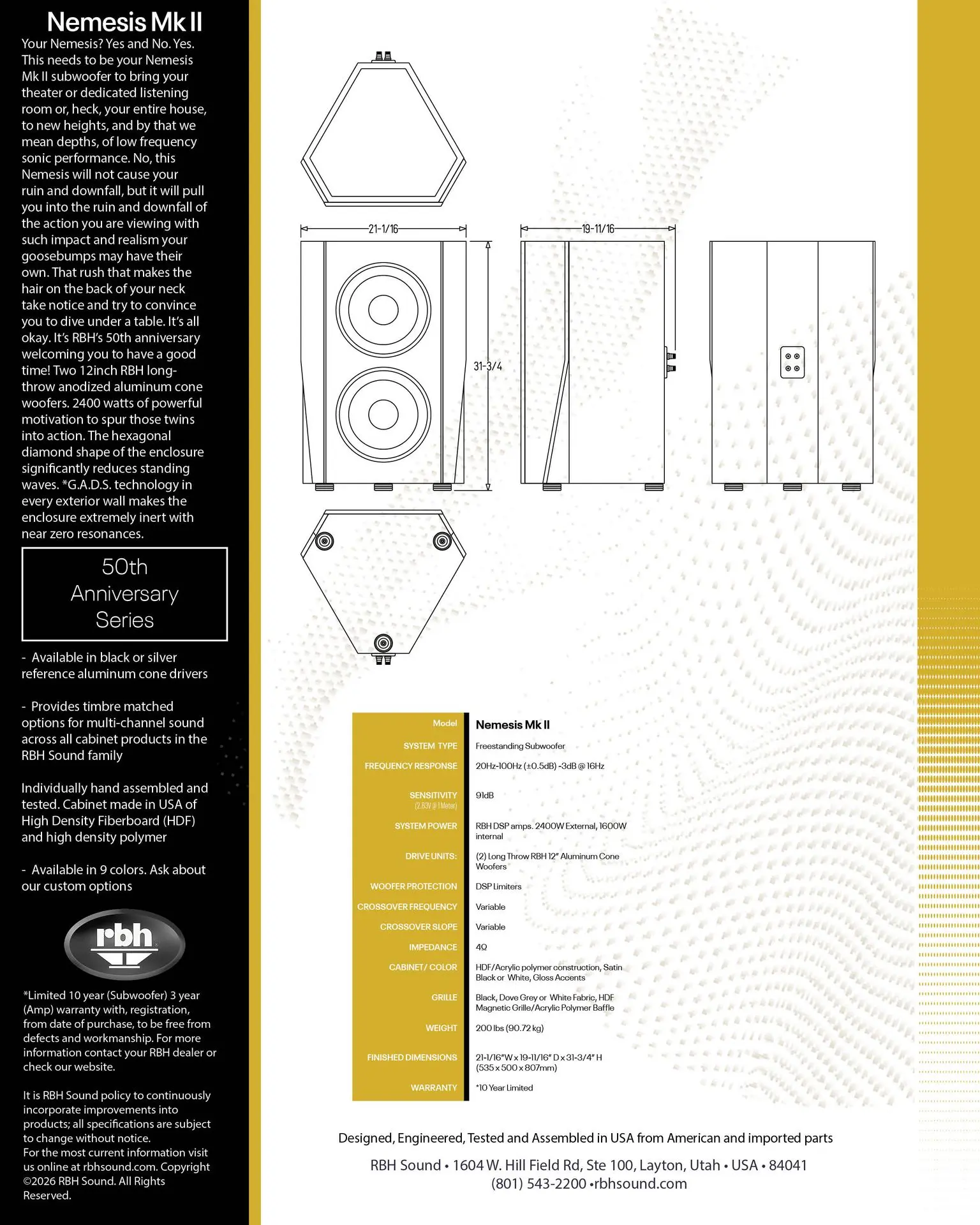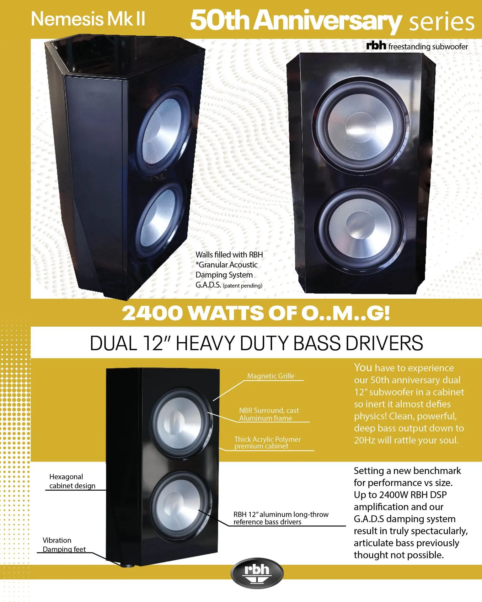 Calling back to the Nemesis of the RBH Status Acoustics line, the Nemesis Mk II brings a presence to any system with bold looks, musical fidelity, and a powerful response, everything you want in a subwoofer! With an anechoic response down to 16hz, Nemesis Mk II can easily hit into the low teens or even single digit frequency response in room. Built with a double enclosure design and G.A.D.S. technology lining every exterior wall, Nemesis Mk II is extremely inert weighing in at 200 lbs. With even the most powerful musical passages, the cabinet doesn't move at all. This results in no loss from cabinet resonance or movement ensuring the cleanest, tightest, and most powerful bass RBH has ever produced in a dual 12" sealed subwoofer.