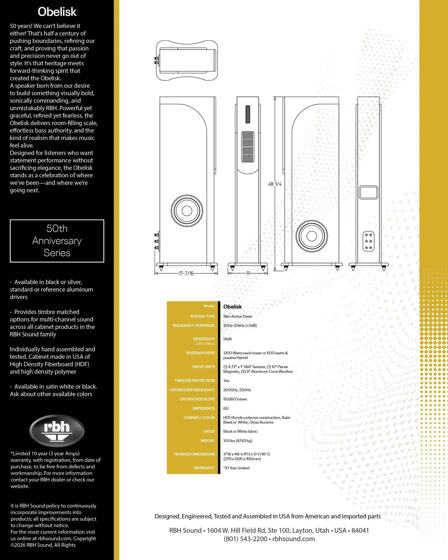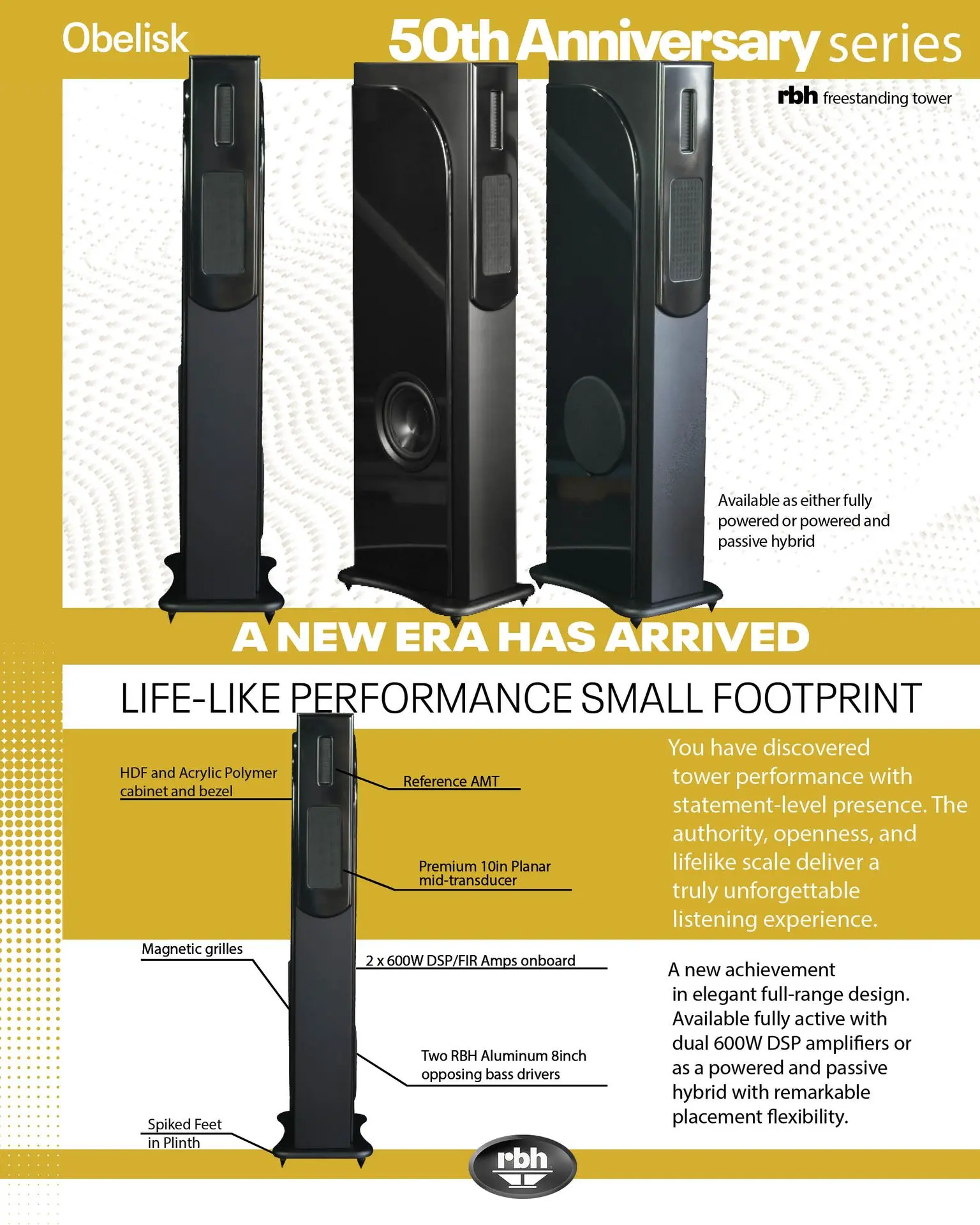 With it's extraordinary debut at AXPONA 2026, the RBH Obelisk active tower took audiences by storm. With it's impressive 14Hz in room response and spectacular mid-range, Obelisk stood out as a contender for best loudspeaker system at the show. Featuring the illustrious large AMT tweeter and a 10" planar magnetic driver with dual opposing 8" long throw aluminum drivers, Obelisk is the complete package. Obelisk excels at virtually anything you throw at it. Enjoy a fully active speaker system with perfect time alignment and phase accurate reproduction for a truly immersive sound. Designed with a minimalistic footprint, Obelisk is meant to integrate into your décor with a stealth approach.
