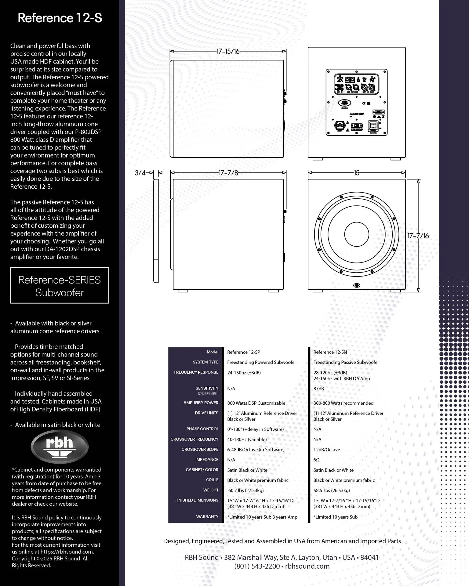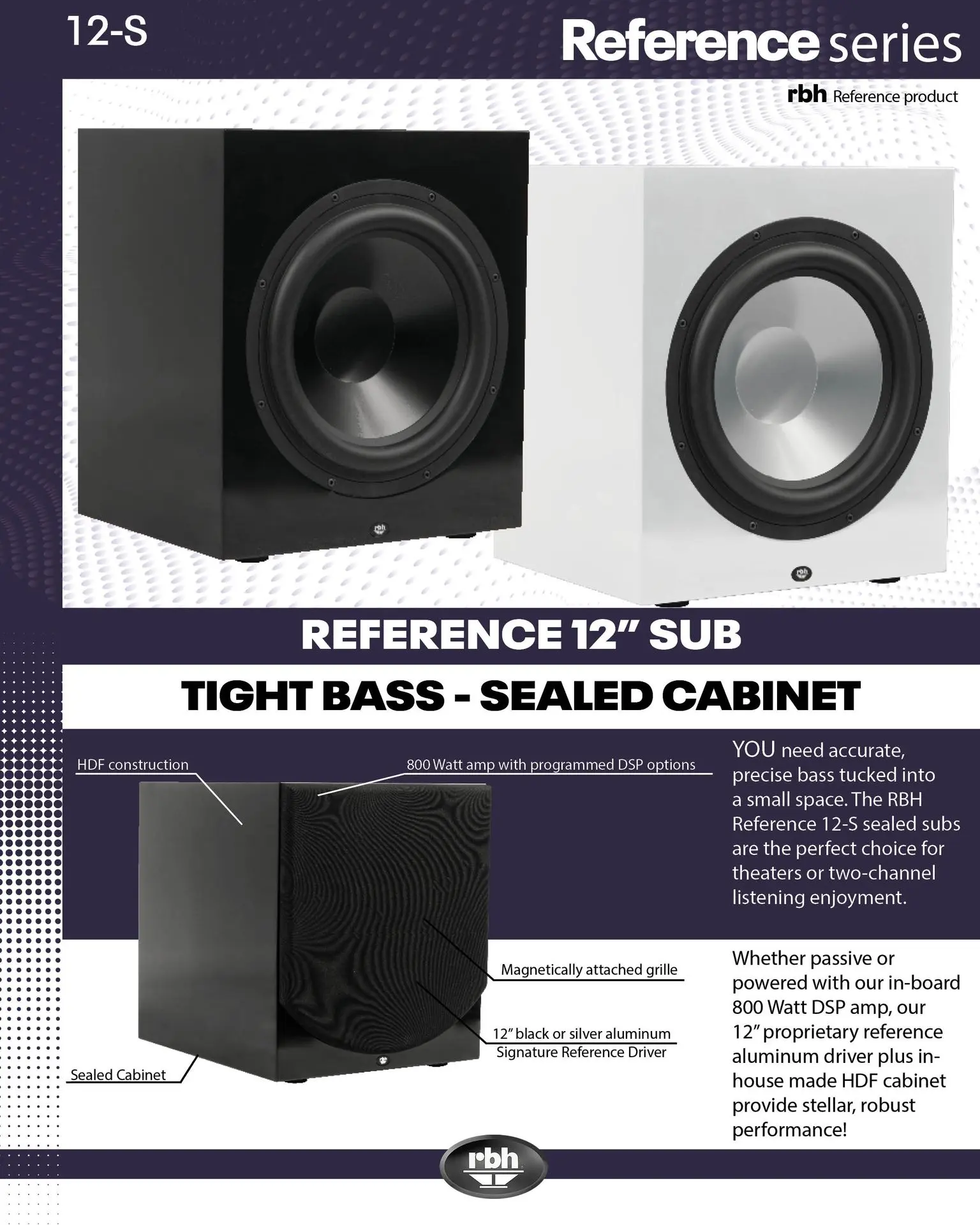 Built to deliver tight and accurate musical bass with power, the Reference 12-S subwoofer is a welcome and conveniently placed “must have” to complete your home theater or 2 channel system.  Whether you go all out with our DA-1202DSP amplifier or have the amplifier built in, the power is in your hands.